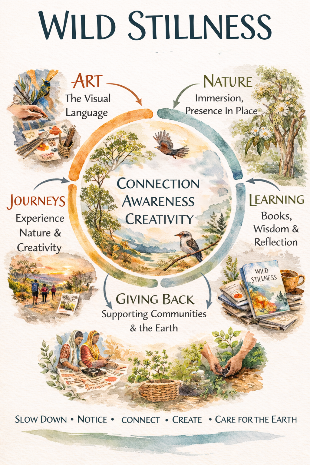 We now have Wild Stillness Journeys — including our recent sold-out journey to India, and Wild Stillness Bali ( only 2 places left) . I’ve been developing new artwork and studio pieces that are inspired by nature and the philosophy behind the book... and now beginning Wild Stillness Block Printing. (page on the way!)